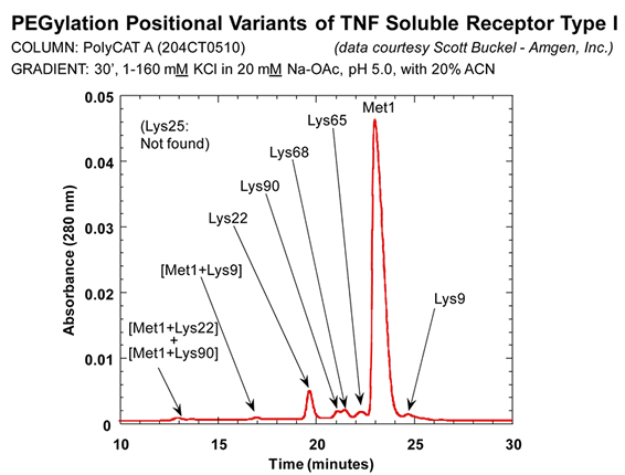 Positional variants: Some proteins are derivatized with polyethylene glycol (PEGylation) to retard their catabolism, prolonging their longevity in circulation. PEG is usually attached to the -SH group in cysteine or an amino group in lysine or at the N-terminus. However, a protein may have more than one -SH or amino group, and a number of products can result that are derivatized to the same extent but at different positions. The example below involves a neurotrophic factor. The main product has a PEG chain on the N-terminus, while the nearby minor variants have PEG chains attached to different Lys- residues. These variants differ dramatically in biological activity.