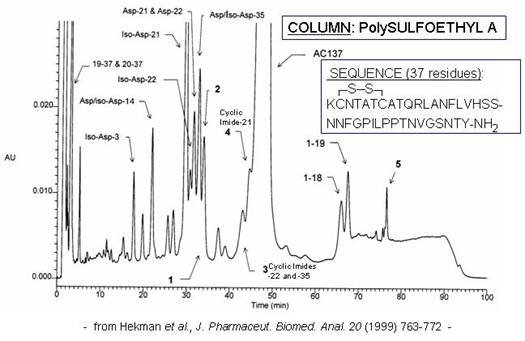 Synthetic polypeptides: These too can experience deamidation and dehydration, in addition to missing residues and nonenzymatic cleavage. The selectivity of ion-exchange HPLC nicely complements that of reversed-phase (RPC), often resolving variants that coelute in RPC. The example below shows the analysis of pramlintide® in an accelerated heat stress test. Pramlintide is a synthetic analog of the pancreatic peptide amylin, which complements the action of insulin in regulating the metabolism of glucose. Pramlintide’s sequence is given below in the figure.
