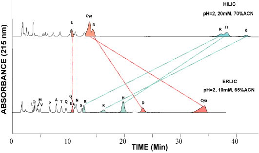 This example shows the separation of amino acids on a PolyHYDROXYETHYL A™ column in the HILIC mode [top] and on a PolyWAX LP™ column in the ERLIC mode [bottom]. Basic amino acids are much better retained than the others in HILIC but not in ERLIC.
