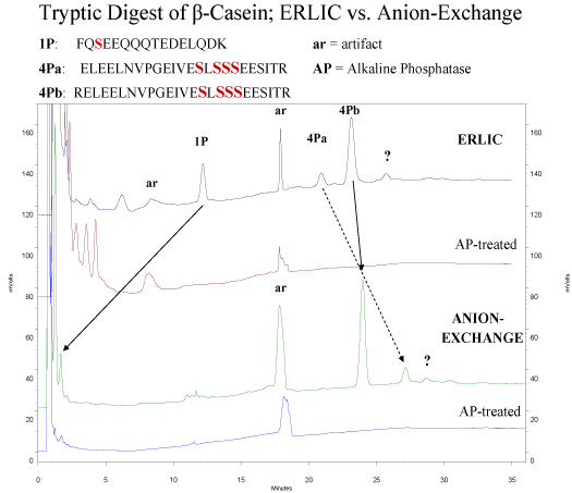 ERLIC of peptides is normally performed with a PolyWAX LP™ column at a pH ~ 2.0, low enough to uncharge carboxyl- groups in peptides. Under these conditions, phosphate groups retain their negative charge and are electrostatically attracted to the column. This attraction is not sufficient to overcome the electrostatic repulsion from the two basic groups in a typical tryptic peptide (the N-terminus and the Lys- or Arg- residue at the C-terminus), which is why anion-exchange has not been used for selective isolation of phosphopeptides from tryptic digests. Phosphate groups are quite hydrophilic, though. In the ERLIC mode the combination of electrostatic attraction and hydrophilic interaction does suffice to pull phosphopeptides away from the nonphosphorylated peptides in a tryptic digest. This is clear from the following example, which contrasts retention of tryptic peptides from beta-casein on the same column in the ERLIC mode and in the anion-exchange mode.