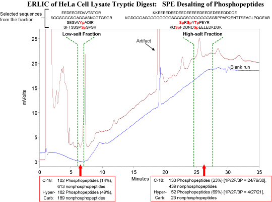 In addition to isolating the phosphopeptides from the nonphosphopeptides in tryptic digests, ERLIC is also a high-resolution method for separating the phosphopeptides from each other. Analysis of a complex digest via ERLIC can easily result in the identification of > 2000 phosphopeptides via bottom-up proteomics methods. Distribution of these phosphopeptides into 20-40 fractions facilitates their identification. Peptides with more than one phosphate group are so strongly retained in ERLIC that a salt gradient is necessary for their elution. If nonvolatile salts are used, then the collected fractions have to be desalted prior to further analysis. The material used for the purpose is important, since many phosphopeptides are too polar to be retained by C-18 material. The following figure compares desalting with HyperCarb vs. desalting with C-18: