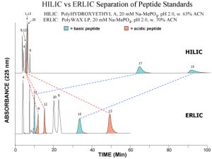 The example below shows the elution of a mixture of acidic, basic and neutral peptidesTOP: HILIC mode on a PolyHYDROXYETHYL A™ column.  The basic peptides are much better retained than the neutral or basic peptides, since basic solutes are the most polar of all.