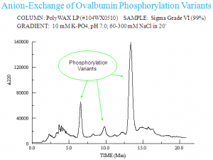 Most proteins have isoelectric points below 7, and are best purified or analyzed by anion-exchange chromatography. PolyWAX LP™ is a hydrophilic weak anion-exchange (WAX) material developed by PolyLC for HPLC of enzymes and other proteins. Selectivity is excellent, with high or quantitative recovery of applied biological activity. Most anion-exchange materials based on polyethyleneimine (PEI) are prepared with the conventional branched polymer. PolyWAX LP™ is prepared with linear PEI, which confers greater selectivity and recovery. The following example demonstrates the ability of PolyWAX LP™ to separate proteins differing by a single phosphate group.