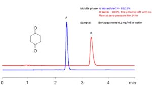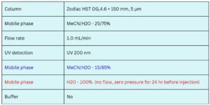 Most reversed-phase HPLC columns, such as C18, are incompatible with 100% aqueous mobile phases due to dewetting (collapse) of the stationary phase. Zodiac HST columns combine reversed-phase with polar functional groups which eliminate the problems of dewetting. The Zodiac HST OG column in this application with an acetonitrile (MeCN, ACN) shows a retention time of 2.5 minutes. In 100% water, the retention time is 3 minutes even after sitting 24 hours in the water mobile phase. On a C18 phase, the analyte retention would have been lost and elution at the void (1.5 minutes) would have resulted.