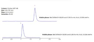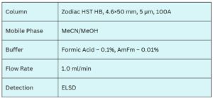 An HPLC method for taurine analysis was developed using the Zodiac HST HB column, which employs hydrogen-bonding as the primary separation mechanism. This method enables effective retention and resolution of taurine. With appropriate modifications, it can be applied to complex sample matrices and is compatible with ELSD or LC/MS detection systems.