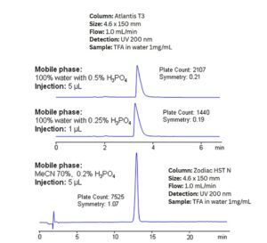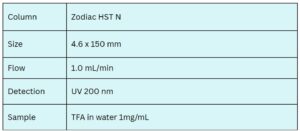 Compared to conventional reversed-phase columns, such as the Atlantis T3 (Waters), Zodiac HST N delivers superior peak shape, improved retention, and enhanced loadability. Optimization of acetonitrile content, buffer pH, and buffer concentration ensures excellent peak symmetry. Detection is typically performed at low UV wavelengths (200 nm). Alternatively, TFA can be effectively quantified using evaporative light scattering detection (ELSD) when using ammonium formate in the mobile phase, which forms a non-volatile salt with ammonia, enhancing detection sensitivity.