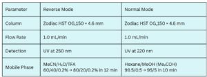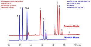 This application illustrates a complete shift in retention behavior of aromatic compounds when switching from reversed-phase to normal-phase mode on the same Zodiac HST OG column. The compounds exhibit opposite interaction profiles and elute in reverse order, demonstrating the dual-mode capability and versatility of the mixed-mode stationary phase.
