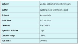 A validated HPLC method for the analysis of Salsalate (Trisalysilic Acid) using the Zodiac C18 column. This method ensures excellent peak resolution, high sensitivity, and reliable quantification, making it suitable for pharmaceutical quality control and formulation analysis.