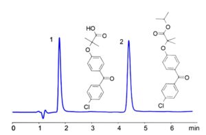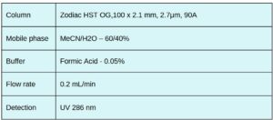 Fenofibric acid and fenofibrate were efficiently separated on the Zodiac HST OG column (100 × 2.1 mm, 2.7 μm, 90 Å) under reversed-phase conditions. The mobile phase consisted of acetonitrile and water (60:40, v/v) with 0.05% formic acid, providing optimal resolution and peak shape. The acidic buffer enhanced separation of the acidic metabolite (fenofibric acid) and the neutral parent compound (fenofibrate). The method was run at a flow rate of 0.2 mL/min with UV detection at 286 nm, offering high sensitivity and precision for pharmaceutical or bioanalytical applications.