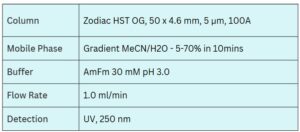 The Zodiac HST OG column operates in one or more of the following modes: reversed-phase, ion-exchange, ion-exclusion, and HILIC, making it a powerful general-purpose column for mixed-mode separations across a wide array of analyte types.