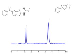 Levamisole and Mebendazole can be retained and separated on a Zodiac HST OG reverse-phase column (3.2 x 100 mm, 5 µm, 100 Å) using a mobile phase of water, acetonitrile (MeCN), and sulfuric acid as a buffer.