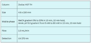 The Zodiac HST TH column employs a trimodal separation mechanism—reversed-phase, cation-exchange, and anion-exchange—which enables high selectivity for structurally similar and highly polar compounds. Retention and resolution can be finely tuned by adjusting the acetonitrile content, buffer concentration, and pH. Additional selectivity is achievable by exploring different buffer systems within the same pH range. This approach is ideal for the analysis of nucleotides and related biomolecules in complex mixtures.