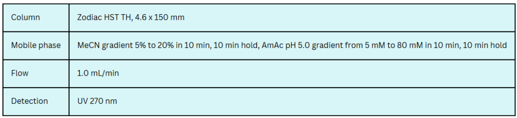 A complex mixture of nicotinamide and related impurities, including methylnicotinamide, nicotinamide adenine mononucleotide, nicotinamide adenine dinucleotide, and adenosine monophosphate, was baseline resolved within 15 minutes using the Zodiac HST TH trimodal column. This mixed-mode method employs reversed-phase, cation-exchange, and anion-exchange mechanisms, making it suitable for analyzing other nucleotides. Retention can be adjusted by varying the amount of ACN, buffer concentration, and buffer pH, with additional selectivity achieved by exploring different buffers within the same pH range.