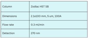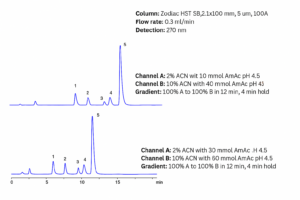 Nucleotides, the building blocks of DNA and RNA, consist of a five-carbon sugar, a nitrogenous base, and one or more phosphate groups. The Zodiac HST SB column is well-suited for separating these highly polar compounds. It is a reverse-phase column embedded with strong basic ion-pairing groups, enabling effective retention and separation. Retention can be tuned by adjusting the acetonitrile concentration, and baseline separation is achievable in under 6 minutes using a gradient method.
