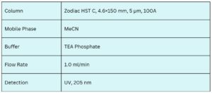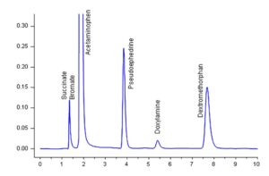 Zodiac HST C effectively separates the active ingredients found in the over-the-counter cold medicine, NyQuil. While succinate and bromate co-elute early, acetaminophen, pseudoephedrine, doxylamine, and dextromethorphan are baseline resolved. The separation is driven by a combination of cation exchange, complex formation, and hydrophobic interactions, using a mobile phase of water, acetonitrile (MeCN, ACN), and triethylamine (TEA) phosphate, with UV detection at 205 nm.