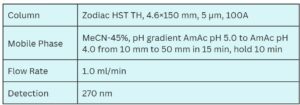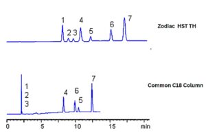 Common hydrophobic and hydrophilic basic drugs are effectively separated using mixed-mode chromatography on the Zodiac HST TH column, offering enhanced selectivity and resolution compared to traditional reversed-phase columns. Compounds are retained through a combination of reversed-phase and cation-exchange mechanisms.