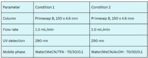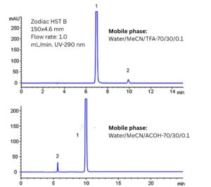 This application using the Zodiac HST B column illustrates the flexibility in tuning separation methods developed on mixed-mode columns. The pyrrole compounds, 5-formyl-1H-pyrrole-3-carboxylic acid and pyrrole-2-carbaldehyde, are efficiently separated, with the elution order easily reversed by switching the mobile phase modifier from trifluoroacetic acid (TFA) to acetic acid (HOAc). This switch impacts both the mobile phase pH and the counterion interaction with the column’s embedded functionality, resulting in changes to retention behavior. The method provides excellent peak shapes using a mass spectrometry-compatible mobile phase of water, acetonitrile (MeCN, ACN), and either TFA or AcOH as the acidic modifier.