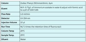 To separate related substances of Fluorouracil using a Zodiac Phenyl column in high-performance liquid chromatography (HPLC) as outlined in the USP method. The USP method for Fluorouracil typically employs a mobile phase that might include a combination of water, acetonitrile, and a buffer. Prepare a standard solution of Fluorouracil with a known concentration. This solution will be used to create a calibration curve and to identify peaks. Equilibrate the Zodiac Phenyl column with the mobile phase before use. Ensure the system is stabilized.