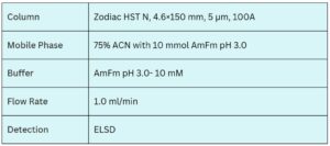 Zodiac HST N, a highly polar stationary phase, was used to successfully separate these trisaccharides. Its ability to employ multiple retention mechanisms makes it ideal for resolving compounds that differ only in regio- and stereochemistry. Despite their close structural resemblance, these trisaccharides were effectively resolved using this method.