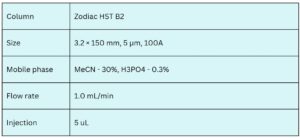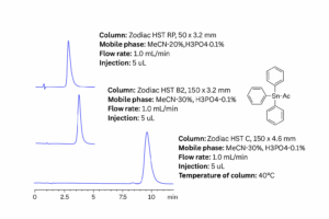 Fentin acetate is a tin-based fungicide widely used in agricultural applications. Its analysis was carried out using three different mixed-mode HPLC columns: Zodiac HST B2, Primesep D, and Primesep C. Each column demonstrated distinct selectivity and retention behavior for fentin, highlighting the versatility of mixed-mode chromatography in optimizing separation based on specific compound characteristics.