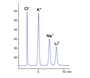 The Zodiac HST C column effectively separates a mixture of inorganic cations—potassium, sodium, and lithium—through a combination of cation-exchange and complexation mechanisms. Unlike traditional cation-exchange columns, the Zodiac HST C column produces a reversed elution order for these cations.
