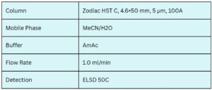 The mobile phase, consisting of water, acetonitrile (MeCN/ACN), and ammonium acetate, is fully compatible with both UV and evaporative light scattering detection (ELSD), making the method suitable for a range of analytical applications.
