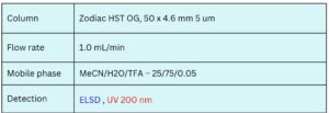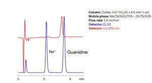 This method demonstrates the analysis of guanidine and sodium ion (Na⁺) using the Zodiac HST OG column, which offers mixed-mode retention combining reversed-phase and ion-exchange interactions. The optimized separation was achieved on a 50 × 4.6 mm, 5 µm Zodiac HST OG column using a mobile phase of MeCN/H₂O/TFA – 25/75/0.05, at a flow rate of 1.0 mL/min.
