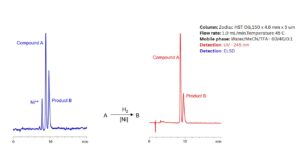 This method demonstrates the use of the Zodiac HST OG mixed-mode HPLC column for the simultaneous analysis of inorganic (Ni²⁺) and organic compounds (Compound A and Product B) in a catalytic hydrogenation reaction. The column effectively separates metal ions and organic analytes under a single chromatographic run.