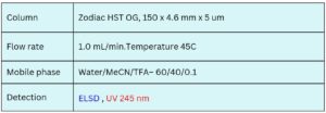 The analysis was performed using a 150 × 4.6 mm, 5 µm Zodiac HST OG column at 45°C with a mobile phase of Water/Acetonitrile/TFA (60/40/0.1) at a flow rate of 1.0 mL/min. Detection was achieved via ELSD for non-UV-active species (e.g., Ni²⁺) and UV at 245 nm for organic compounds.