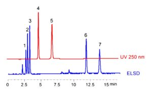 The method employs a gradient elution from ammonium formate (AmFm) to ammonium acetate (AmAc) buffers at pH 4.0, making it suitable for LC-MS applications. The detection is carried out using both UV at 250 nm (for parabens) and ELSD (Evaporative Light Scattering Detector) for amino acids, which lack strong UV chromophores.