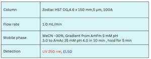 This setup demonstrates the power of Zodiac HST OG reversed-phase and ion-exchange retention mechanisms to achieve excellent separation of chemically diverse compounds in a single run.