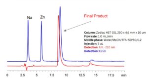 The Zodiac HST OG mixed-mode column offers a single-step solution. Its integrated reversed-phase and ion-exchange functionality allows simultaneous analysis of both organic and inorganic components using standard HPLC equipment. When paired with UV and ELSD detection, it provides an efficient and accurate method suitable for pharmaceuticals, research, and QC labs.