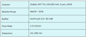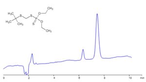 Terbufos is a highly toxic organophosphate insecticide and nematicide. It can be effectively retained and separated from impurities using the Zodiac HST TH column. This column incorporates both ionic and hydrophobic functional groups within the stationary phase, allowing for precise control over separation conditions. The method is compatible with LC/MS detection and provides a robust approach for analyzing terbufos and other organophosphate insecticides.