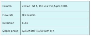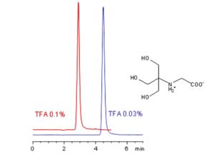 Zodiac HST A retains the hydrophilic zwitterion tricine through a combination of polar interactions and ion exchange. Tricine, which is not retained by traditional reversed-phase chromatography, can be effectively separated on Zodiac HST A. Retention can be tuned by adjusting the concentration of trifluoroacetic acid (TFA) in the mobile phase. The method delivers excellent peak shapes using a mass spectrometry-compatible mobile phase of water, acetonitrile (MeCN, ACN), and TFA, with detection by evaporative light scattering (ELSD).