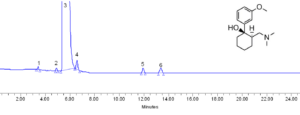 This HPLC method uses a Zodiac 120 C18 AQ column with a 30:70 acetonitrile mobile phase to separate and identify Tramadol HCl and its impurities (Impurity-D, RC-A, N-Oxide, Impurity-C, Impurity-B) at 270 nm. The analysis is performed at a flow rate of 1.0 ml/min, with a 20-minute run time and 20 µL injection volume.