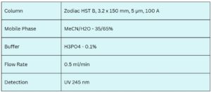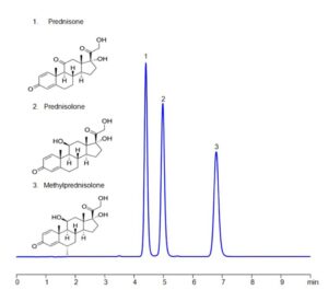 These corticosteroids can be efficiently separated and analyzed using the Zodiac HST B mixed-mode column. The method employs an isocratic mobile phase of water, acetonitrile (MeCN), and sulfuric acid, with UV detection at 245 nm for precise analysis.